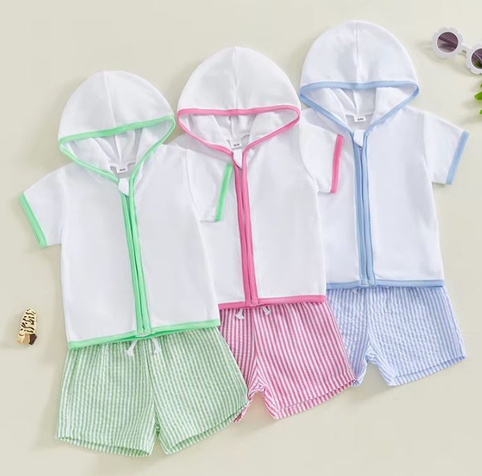 Keep your little one stylish and comfortable with our kids' beach set, featuring a cozy zip-up hooded top and shorts. Perfect for breezy beach days, the lightweight t-shirt keeps them cool under the sun, while the hooded top adds an extra layer for when the temperature drops. Made from soft, breathable fabric, this set is designed for all-day comfort, whether they're building sandcastles or exploring the shoreline. A must-have for summer adventures!