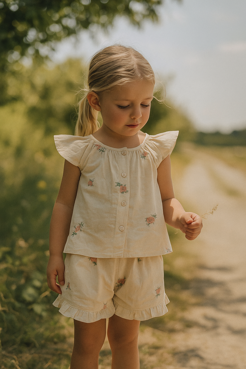 A beautifully lightweight and breathable summer set for girls, featuring delicate floral embroidery and soft ruffle details. Perfect for warm days, this charming outfit offers both comfort and timeless style for little ones to enjoy the sunshine in.
