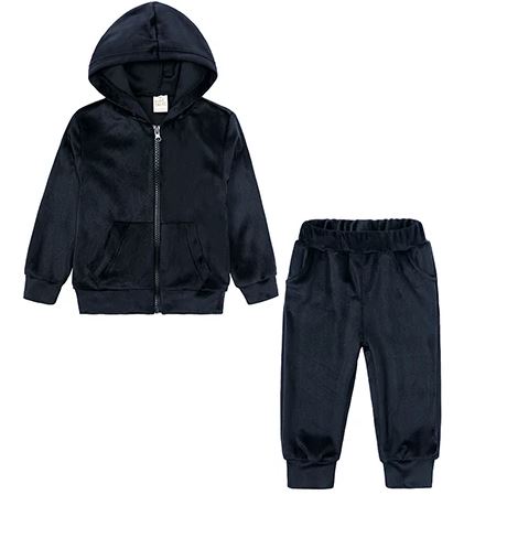 A velvet zip-up tracksuit is a luxurious and stylish option for kids' activewear or casual outings. Typically consisting of a zip-up hoodie and matching pants, this tracksuit is crafted from soft and plush velvet fabric, providing both comfort and sophistication. The zip-up hoodie features a convenient front zipper for easy dressing and added warmth, while the matching pants offer a comfortable fit with an elastic waistband. The velvet material adds a touch of elegance and texture to the ensemble, making it suitable for various occasions. Whether for sports practice, weekend outings, or lounging at home, a velvet zip-up tracksuit ensures your little one stays cozy and chic in style.